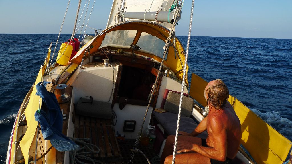 Stvrtu noc (ktora stale este nebola posledna), som hned bez dlheho zvazovania kategorizoval medzi svoje 3 najmenej prijemne mojho zivota (Karpatska Horka spojena s prvou sablovackou v mojom vtedy na den 20 rocnom zivote, a moj oblubeny Mariscal s Brankom doplnaju rebricek). Cely den bol horuci, o kvas a relax na doku bolo postarane. Chytam slnko a uz sa mi dokonca da aj citat, preto trochu mordujem spanielcinu. I ked jem, zdravy apetit mi uz od druheho dna plavby tak trochu chyba. Vecera na plavajucej lodi pri zapade slnka s piveckom v ruke je velmi chutna, no nejako mi neide. I ked fungujem uz bez akychkolvek podpornych tabliet, zaludok uz piska po pevnine. Ani hodku po tom, co laham a dycham alfu, zacina vonku santit komando vln kalibru 4-5 metrov, ktore s lahkostou prelietavaju ponad celu lod. Ja, poloskuseny po tretej noci, som uz so zavretym vetrakom a naivne dufam, ze zaspim a v klidu to prezijem. Avsak 25-27 uzlov rychly vietor dava o sebe tiez vediet a ja cochvila smykam v kaskade troch matracov a aspon styroch podusiek na zem. S lodou to neskutocne hadze, vsetky nepriviazane veci padaju vsade navokol a ja cakam kazdu chvilu nejaku bonusovku na svojej lebecnej kosti.