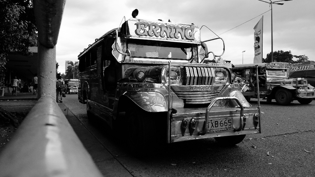 Z terminalu teda beriem tzv. jeepney. Je to forma miestnej MHD inak s uplne perfis imidzom. Nejaki filipinski borci prisli po 2.sv.vojne s napadom prevziat masku americkeho povojnoveho jeepu a spojit ju s mensou dodavkou, ktora ma pozdlz obidvoch stran celeho trupu uzke okna bez skiel. Cely skeleton vyzera tvrde zelezne a farby si operator necha bud povodne chromo/sede alebo je jeho jeepney ligotavou vystavnou skrinou ako su busy Latinskej Ameriky s portretmi od rapperov sveta a la Eminem, Dr.Dre az po vsetkych svatych. Kapacita sa pohybuje zhruba medzi 10-25+, k tomu sediaci na dverach alebo visiaci vzadu na rebriku. Zastavky su na znamenie, tych je tolko ako v Nikarague, cize vsade podla potreby. Aktivuju sa spanielskym pokrikom ‘para’ (v preklade stop/zastav; spanielciny je tak ako anglictiny v dnesnej ‘filipincine’ fakt hodne) alebo udieranim ci klopanim napr. niecoho kovoveho po rucke ci karoserii vo vnutri jeepney.